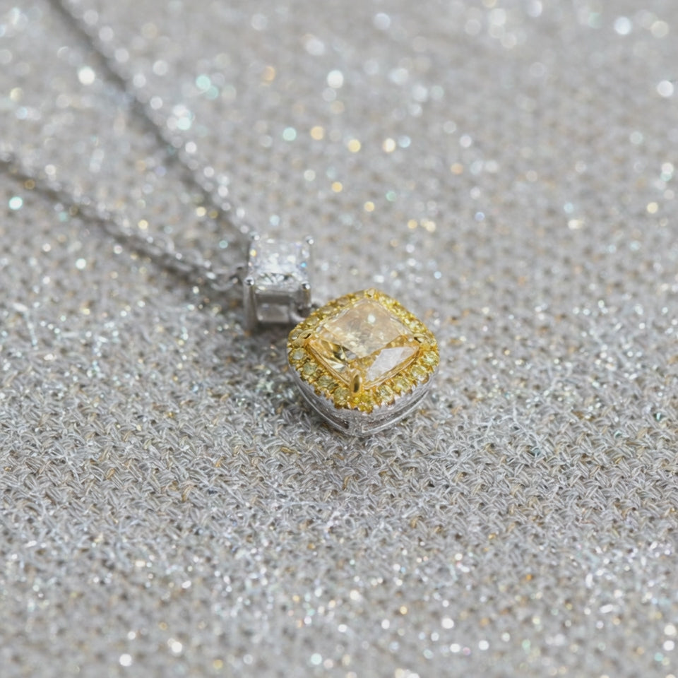 Nova High N033 is an 18 kt gold high jewellery necklace featuring a vivid cushion-cut yellow centre stone framed by a delicate halo of white or coloured diamonds. The pendant is suspended from a fine chain, creating a luminous focus of colour and light on the neckline.